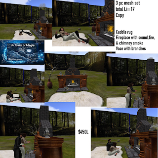 fur cuddle rug for too with bento animations and auto prop, fireplace with fire on/off options, sounds, decor, vase with branches decor, 3 pc mesh set total LI=17 mesh copy